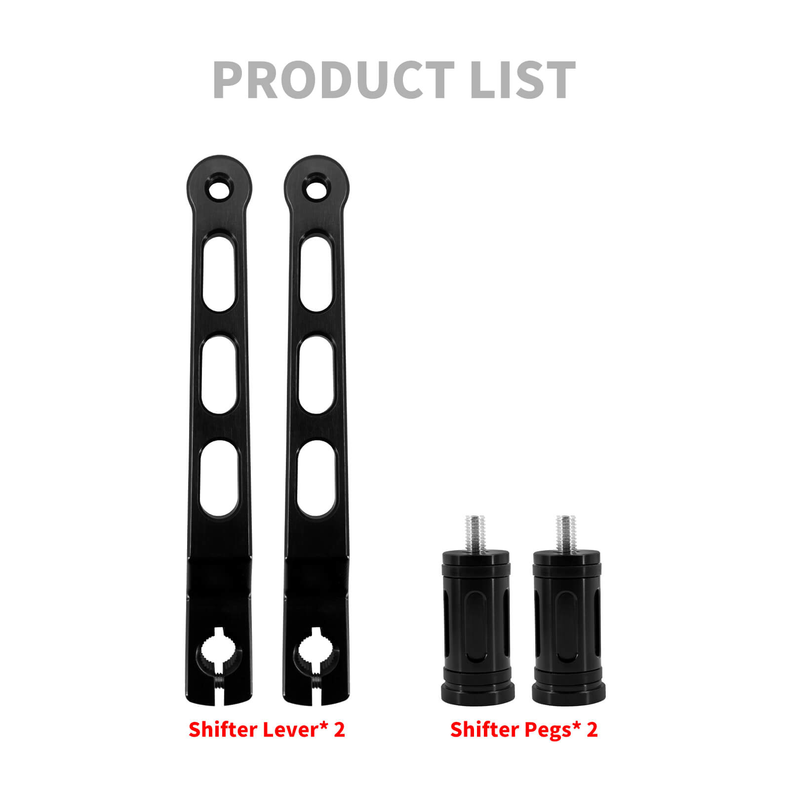 Package includes 1*Front Shift Lever (Toe) + 1*Rear Shift Lever (Heel) + 2*Shifter Pegs